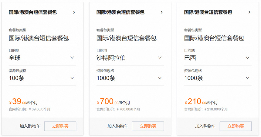 阿里云国际/港澳台短信包价格:100条 39元/6个月。