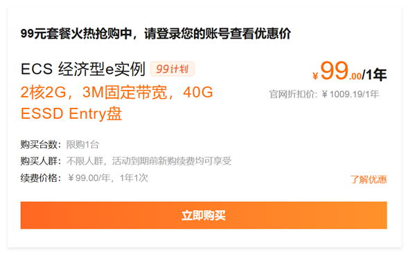阿里云2核2G 云服务器购买价格:99元/年。