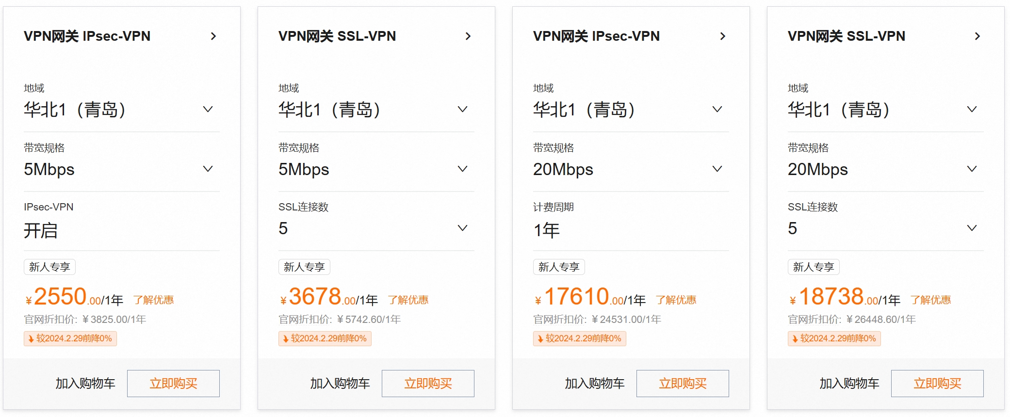 阿里云VPN网关 IPsec-VPN,5M,1550元/年。