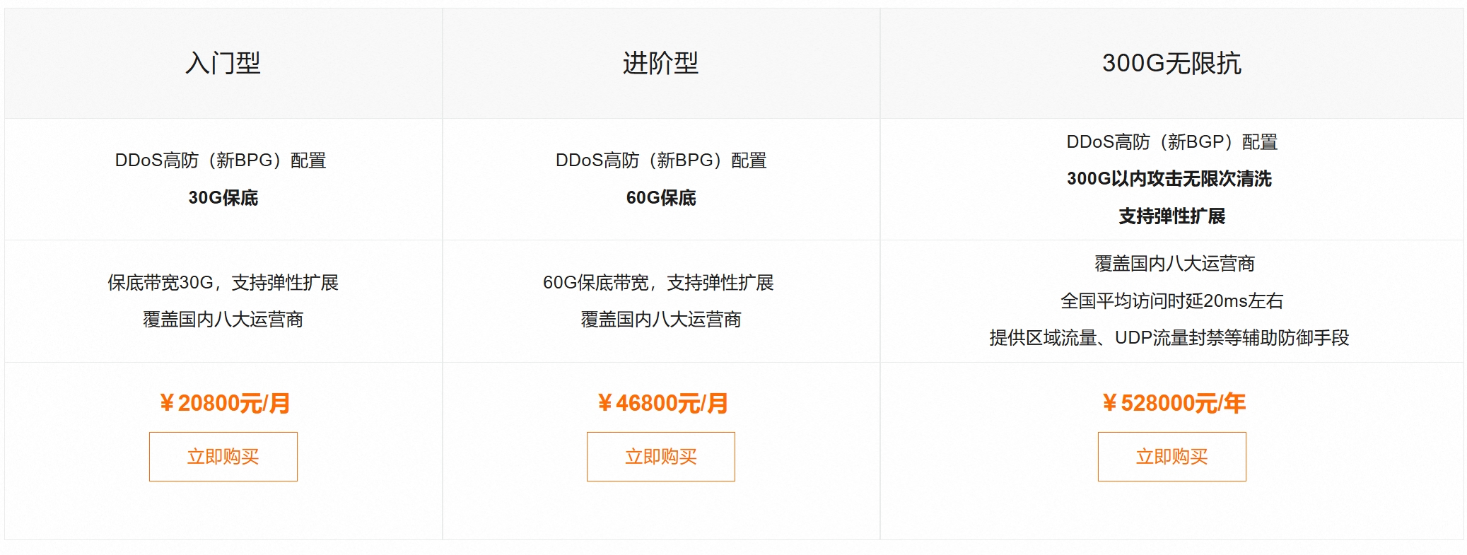 阿里云DDoS高防 IP(新BGP)收费标准:入门型,配置30G保底,购买价格 20800元/月。保底带宽30G,支持弹性扩展,覆盖国内八大运营商。